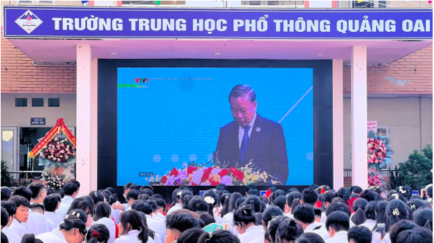 Ảnh: Toàn trường cùng nghe Tổng Bí thư Tô Lâm phát biểu trong Lễ khai giảng