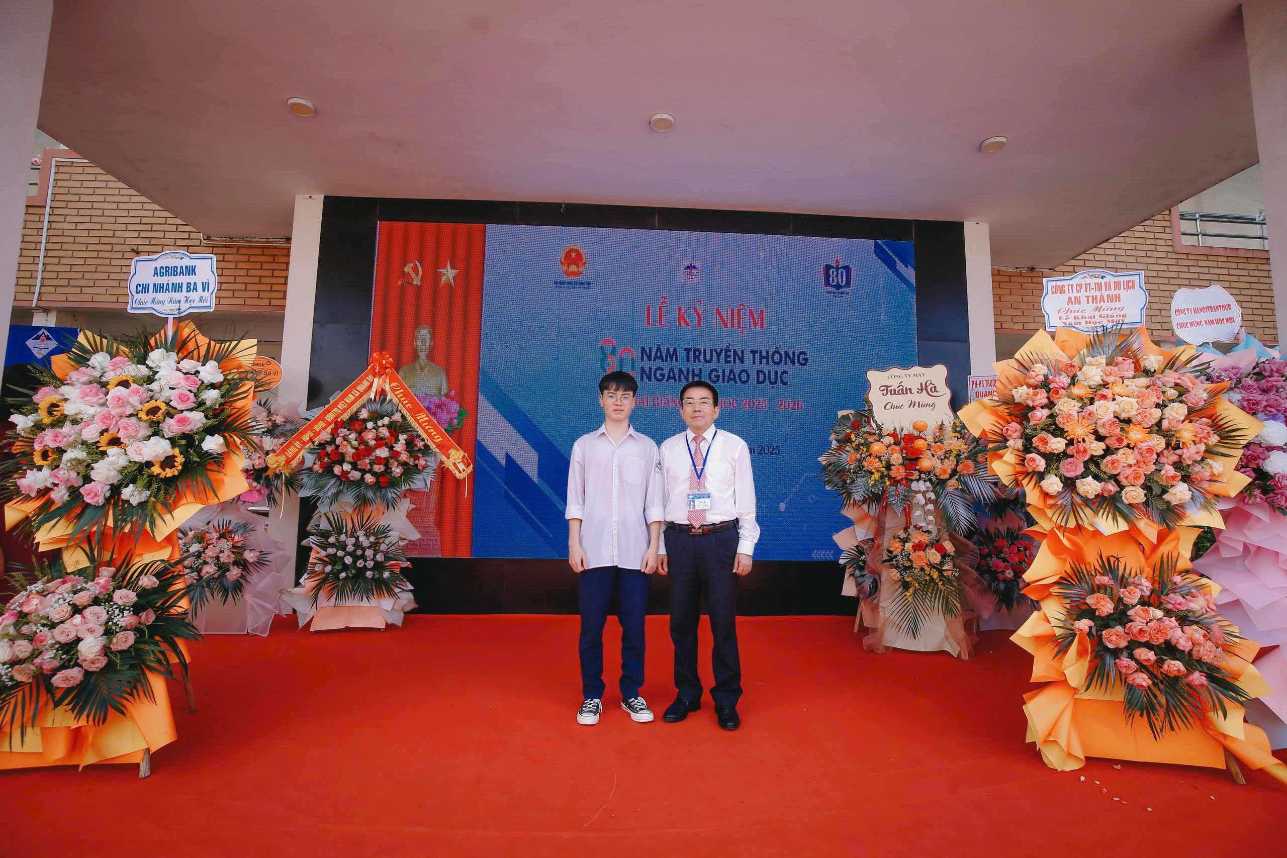 Thầy Hiệu trưởng Vũ Ba Lê chụp ảnh cùng em Nguyễn Văn Hồng Kỳ tân sinh viên ĐH Bách Khoa