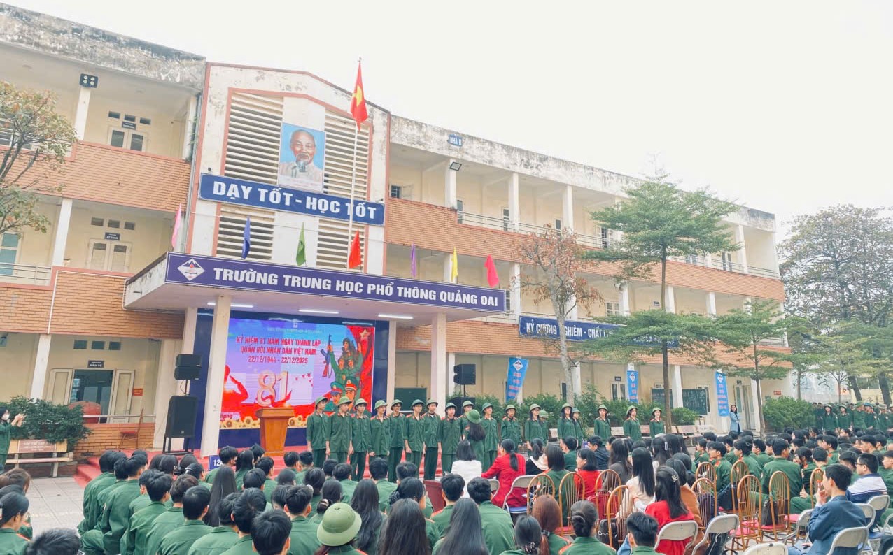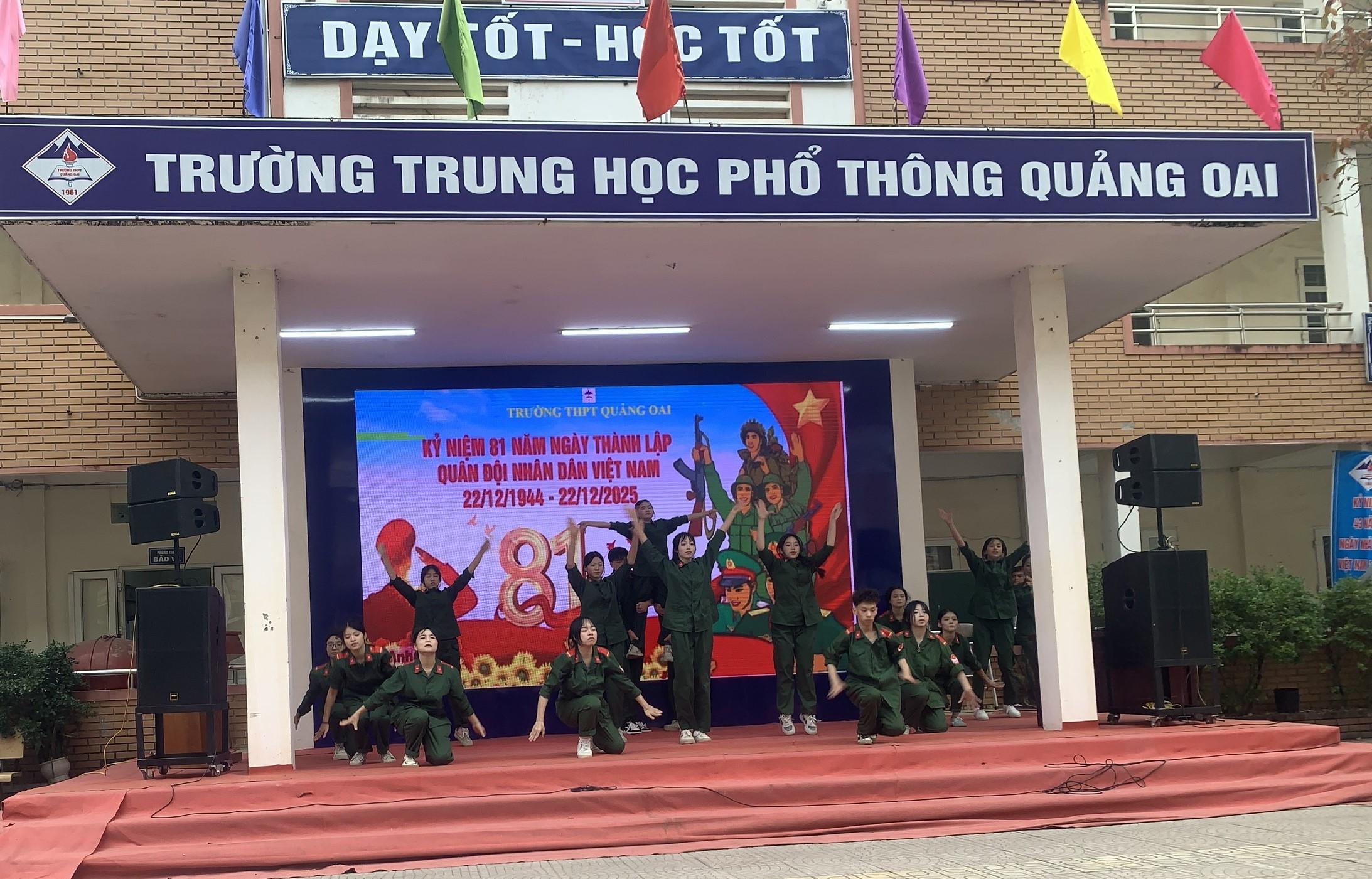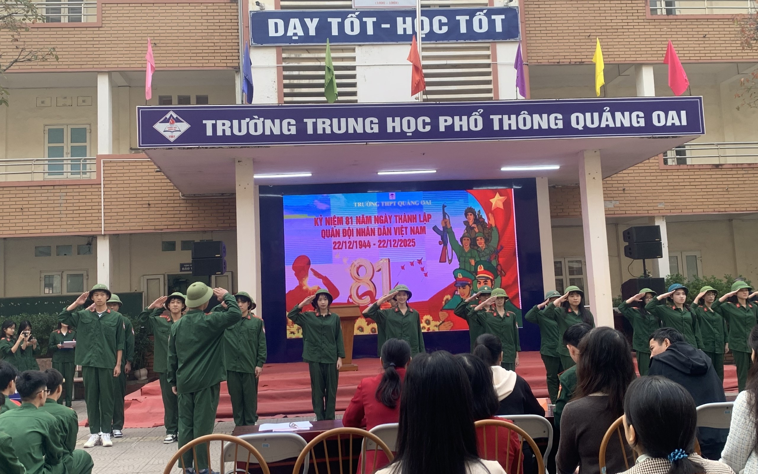 Nhân kỷ niệm 81 năm Ngày thành lập Quân đội nhân dân Việt Nam và 36 năm Ngày hội Quốc phòng toàn dân 22/12, Trường THPT Quảng Oai đã tổ chức nhiều hoạt động thiết thực, ý nghĩa nhằm tuyên truyền, giáo dục truyền thống cách mạng, lòng yêu nước và ý thức trách nhiệm đối với sự nghiệp xây dựng và bảo vệ Tổ quốc cho cán bộ, giáo viên, nhân viên và học sinh toàn trường.